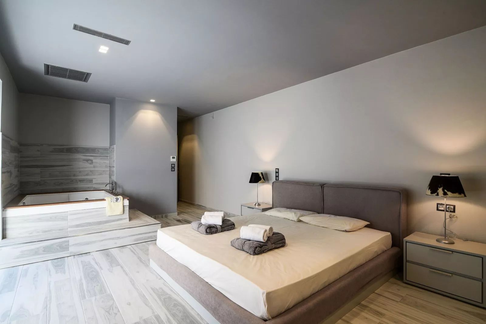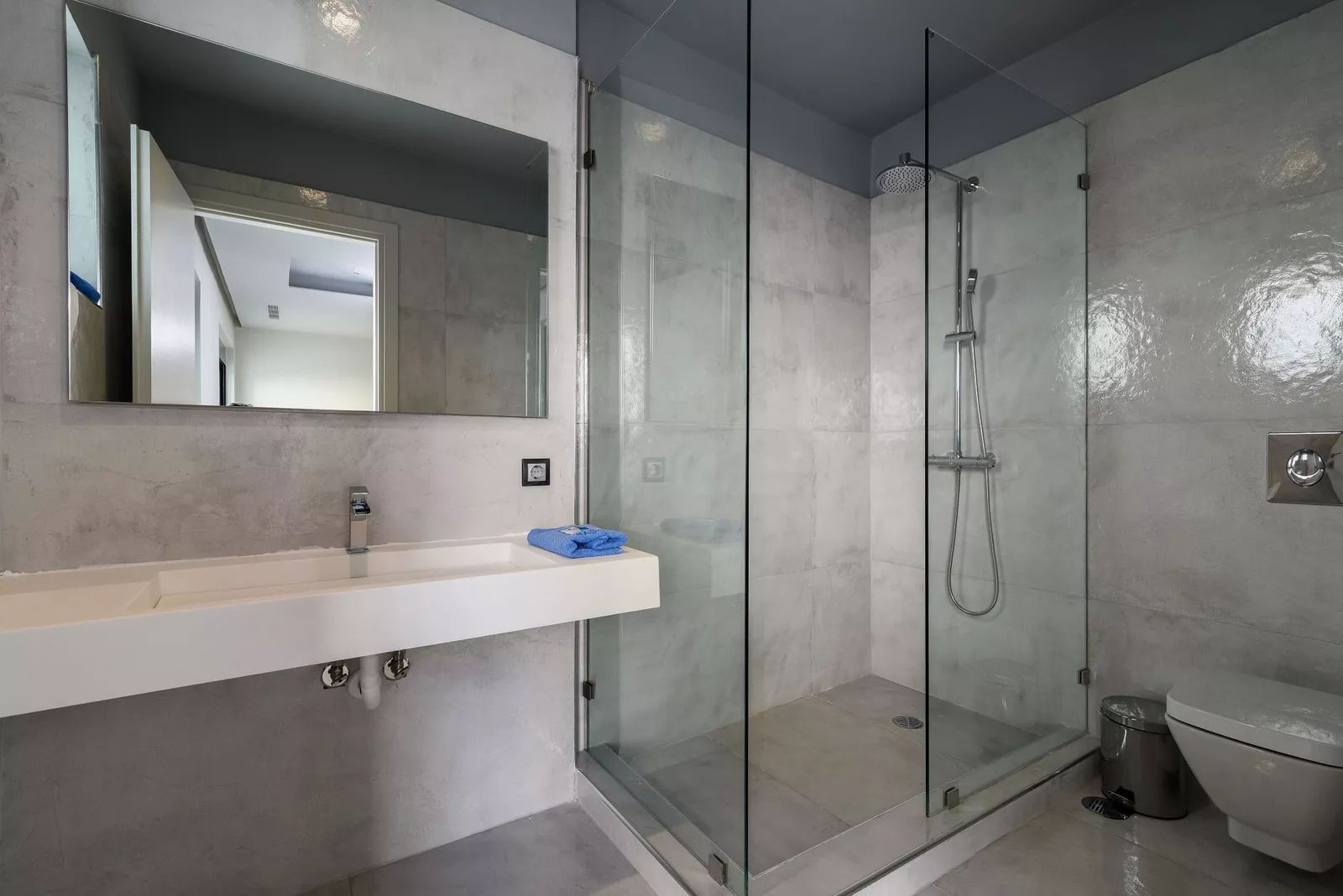 The large villa has an area of 400 m². The generous floor plan of this magnificent architectural piece has five (5) bedrooms, two of which have a hydromassage bathtub right next to the bed, five (5) bathrooms and one (1) toilet. A large rectangular living room with a designer bar, like the icing on the cake. An unconventional solution and sophisticated kitchen design, which is a remarkable dominant in the interior of the dining room. The combination of marble, wood and concrete perfectly creates a single whole and the soul of the residence. A private private pool with an area of 90 m².
