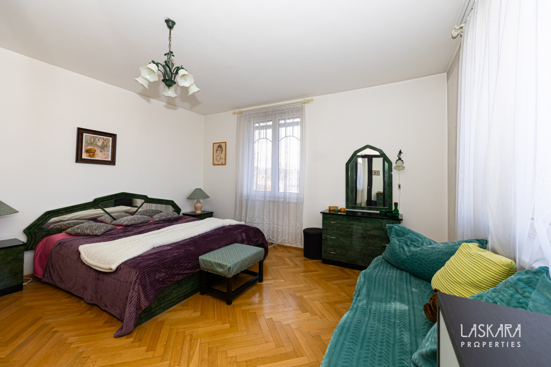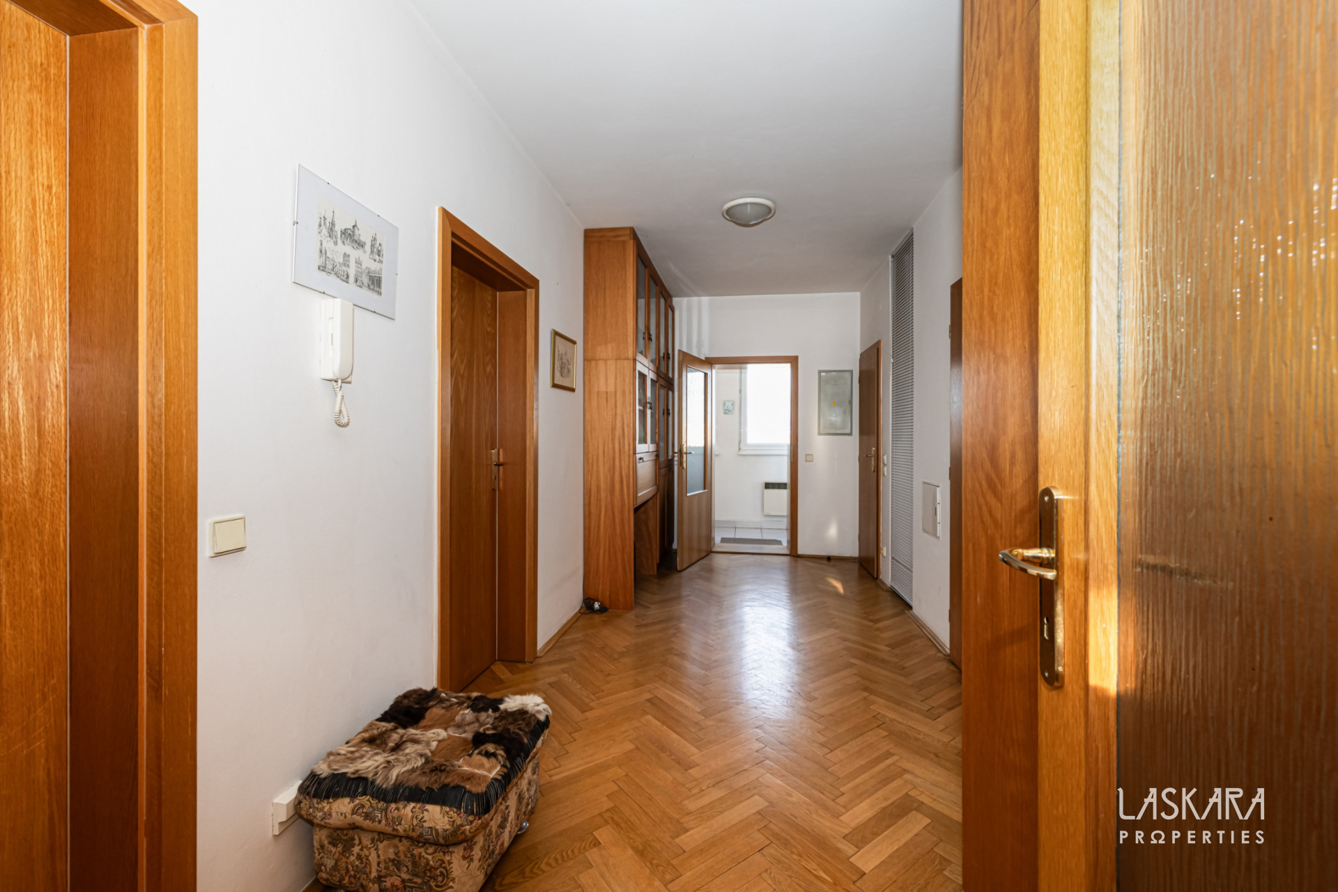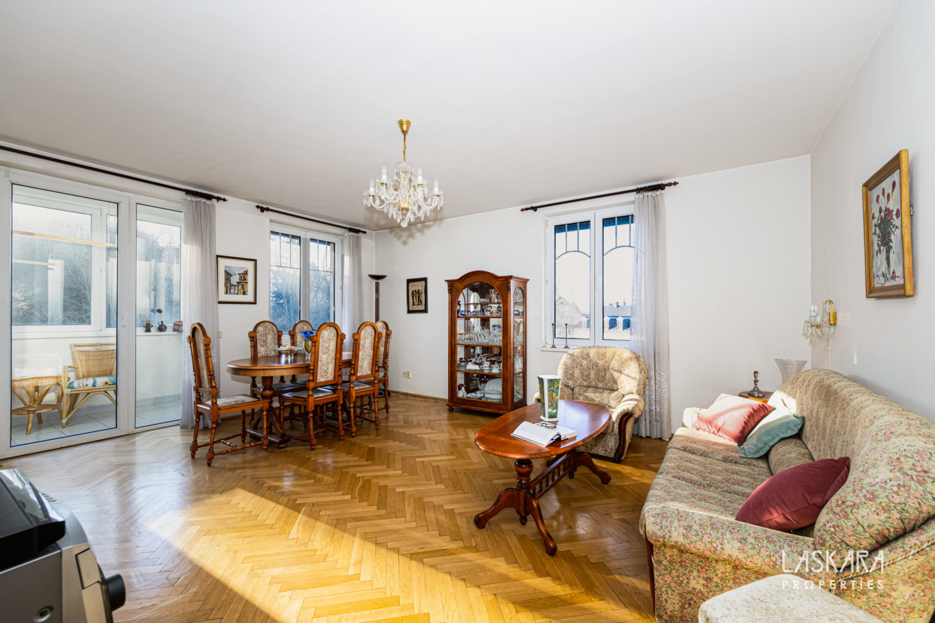A genuinely generous 90 m² of living space with a separate kitchen and dining area, a spacious living room with direct access to a balcony, a large bedroom, two enclosed balconies accessible from the living room and the entrance hall, oak parquet floors in the living areas, a bathroom and a separate toilet. The apartment is sold fully furnished and ready for immediate use or rental. The layout is ideal both for comfortable owner-occupation and for launching a rental strategy without additional investment.